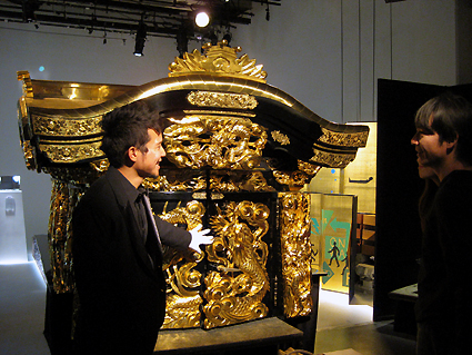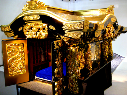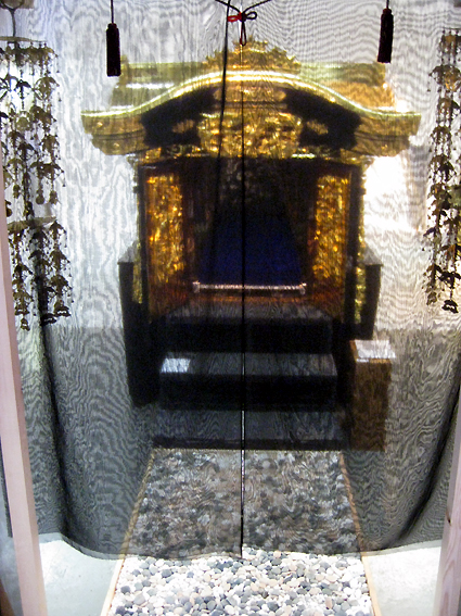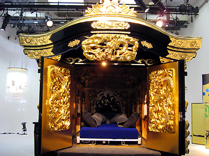 (紗幕の向こうには。。) 「ベッド」 コンセプト 死を想え! 「メメントモリ」とは「死を想え」というラテン語で、芸術作品のモチーフとして広く使われます。なぜ、わざわざ「死を想う」ということを考えるのでしょう。 近年、産業化にともない人の死の弔(とむら)い方が急変。人は死を見ることを恐れすぎるあまり、死を直面することへの拒否反応も激しくなっています。 霊柩車への考え方も、忌み嫌うようなところも見受けられ、なるべく見ないようにしてきているのが、社会の風潮でしょう。 しかし、人は100%死んでいきます。 (kyota霊柩運に横たわる) もともと、霊柩車は亡くなった方への最大の配慮、そして最高の浄土へ導くためにあり、仏になるよう暖かい気持ちで送り届けられるように作られたはずです。 霊柩運送事業は、根拠とする法律の名称のとおり、貨物自動車(トラック)事業の仲間とされています。これは民法上の規定によって「人間」はその死を境に「物」に変るため、その「物」であるご遺体を輸送する霊柩運送事業は、貨物自動車運送事業であるということが理由となっています(全国霊柩自動車協会HPより) この高度社会では、目の前で遺体を見ることもほとんどありません。それとともに、自殺者が激増したり、昨今の秋葉原通り魔事件のように、簡単に人を殺したりしています。 これは、「死を見つめる」という機会が少なすぎるからでもあるのではないでしょうか。戦争時に自殺者は減るといわれます。生きていこうという気持ちのほうが大きくなるからでしょう。 死を見ないようにするがうえに、死は遠いものとなり、生きていくことの意義を薄れさせるのです。 そこで今回、「死を想う」「死を見つめる」「体感する」という意味も込めて、霊柩車をあえて都会の真ん中にあるスペースに展示しようと考えました。日常考えもしない場所で「死」というものに向き合い、横たわることで思考を深める、という大いなる意義を持つものになることと思います。 (来場者にベッドへいざなうkyota)